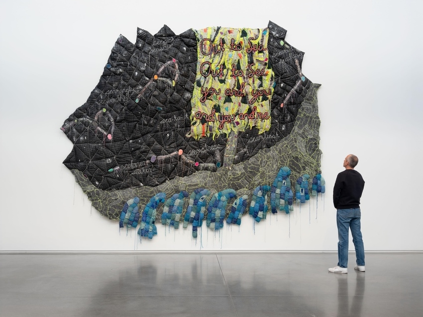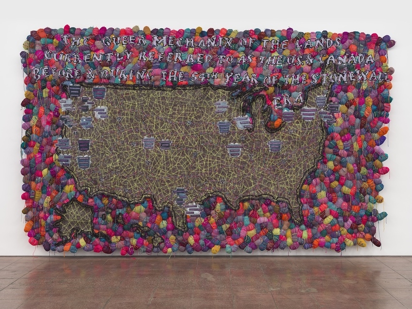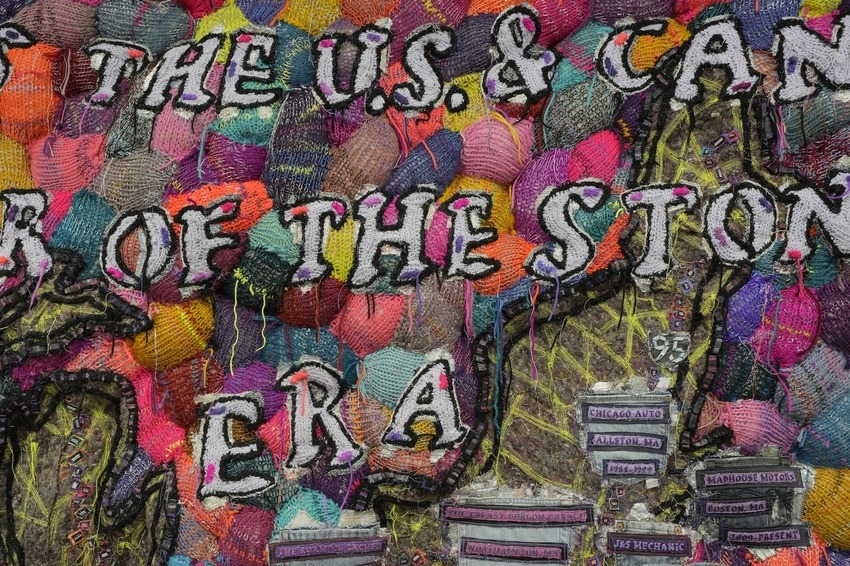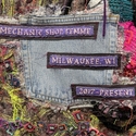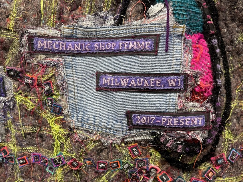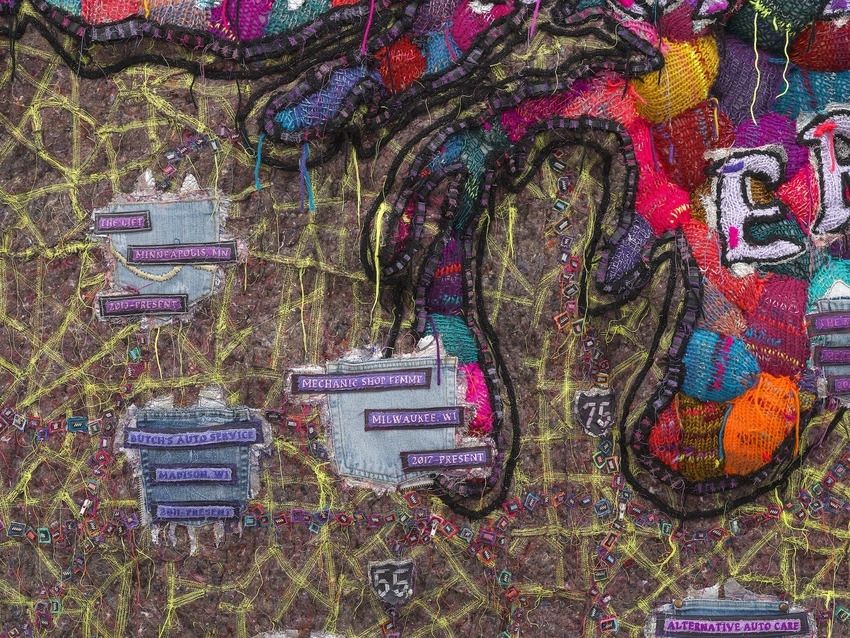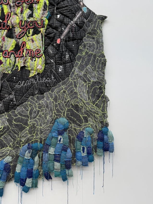 Yarn, leather, lace, recycled bike inner tubes, thread, poly-fil, hacked Lite Brites, metalstuds, zippers, lurex, shoelaces.