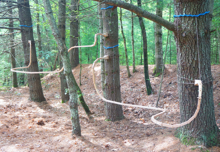 2 x 4 boards, wooden dowels, rope, and nylon thread