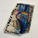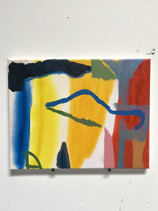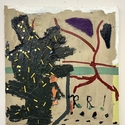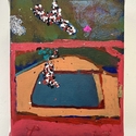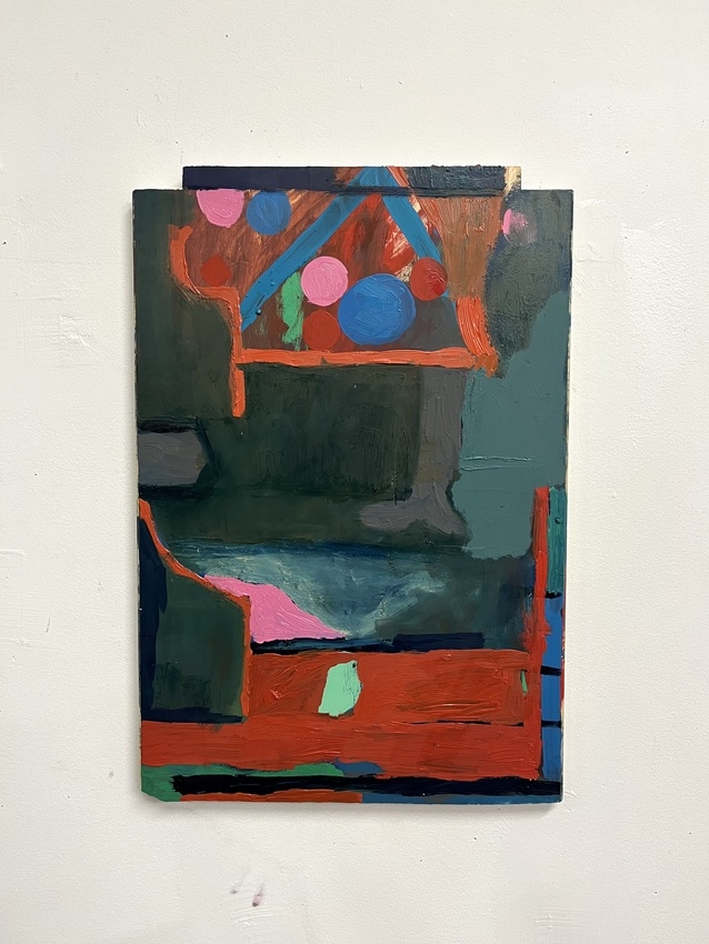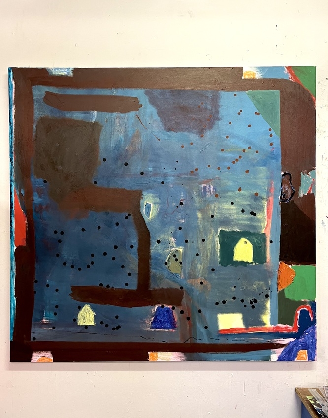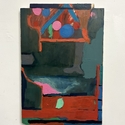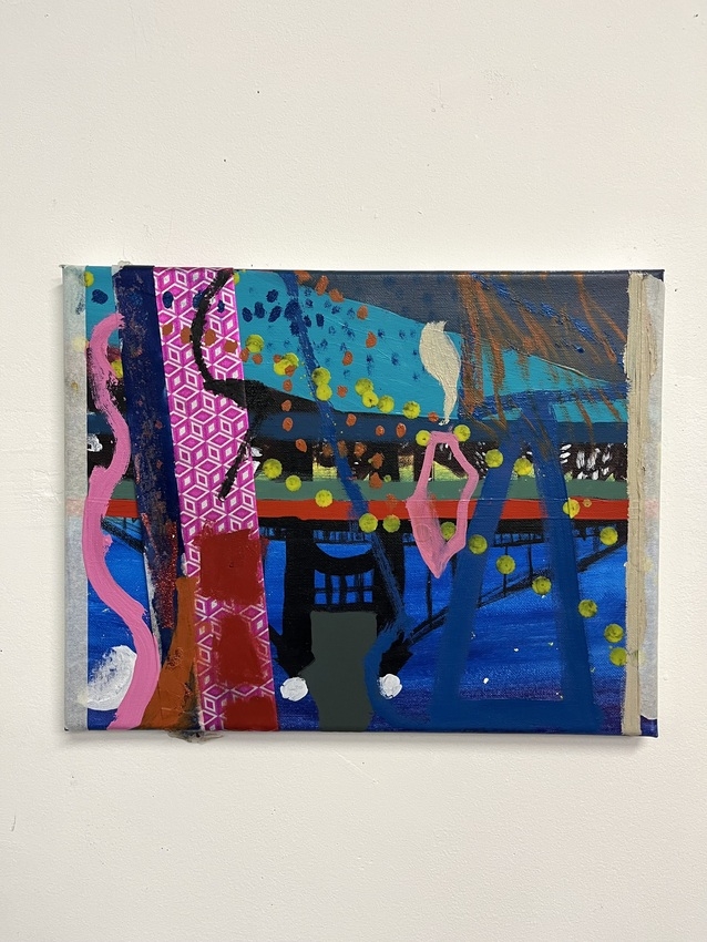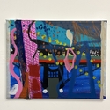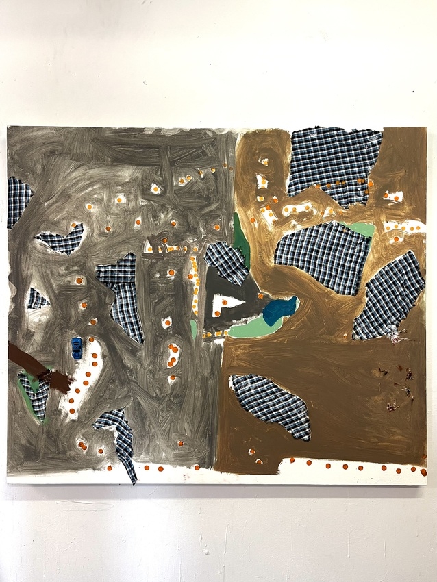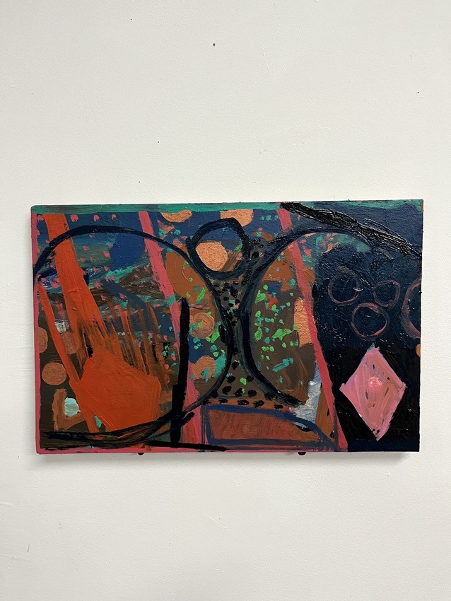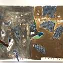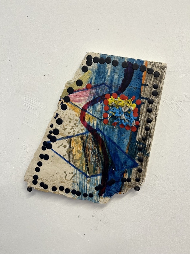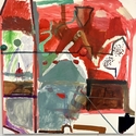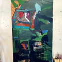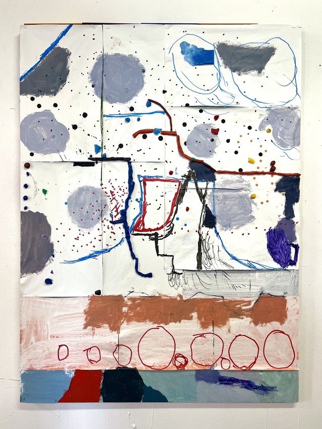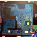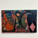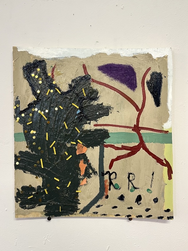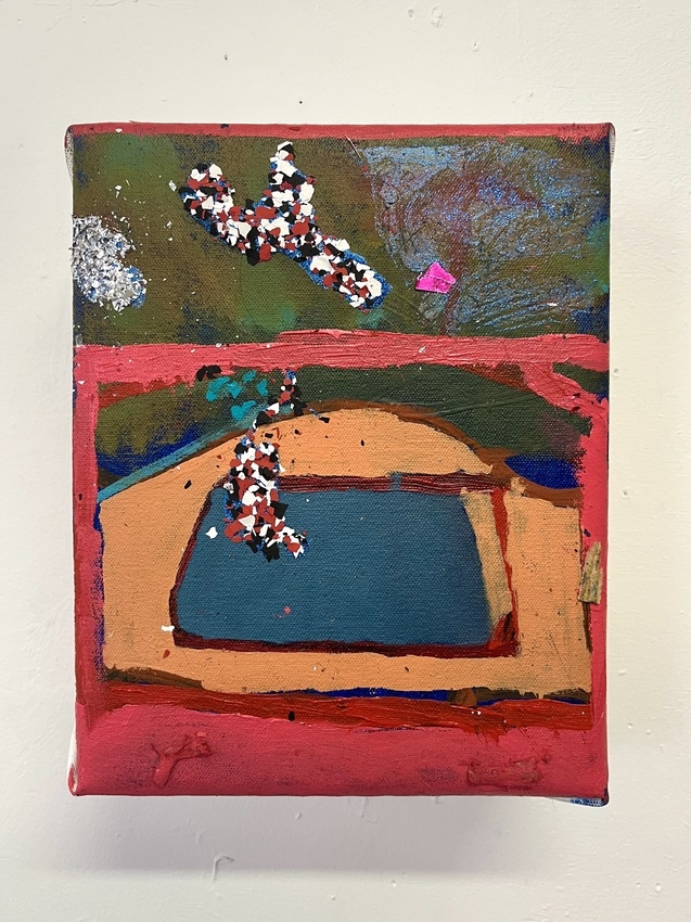 Oil, paper, glitter, marker, tape, crayon on canvas stretched over wood panel