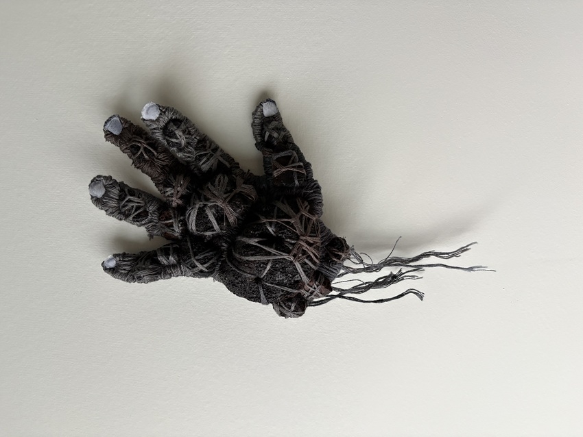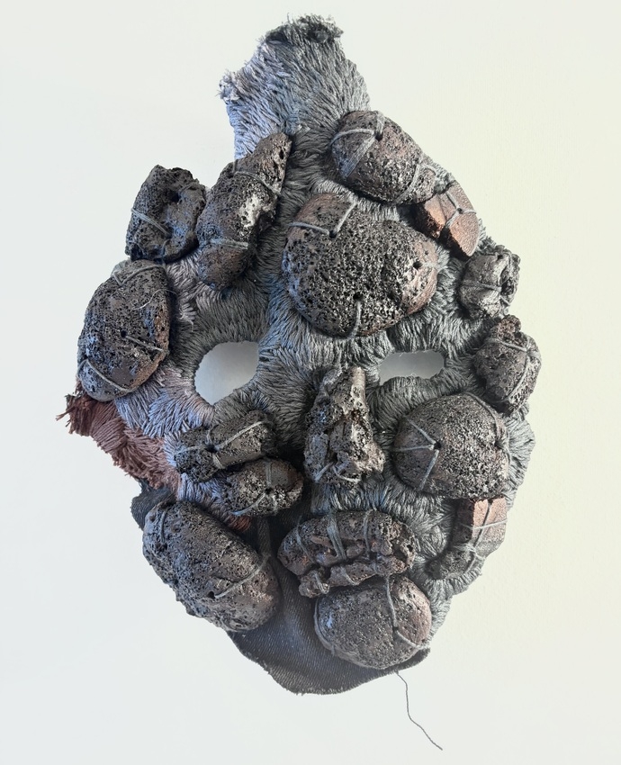 Burnt muffin batter, burnt Eggo pancakes, embroidery floss, denim