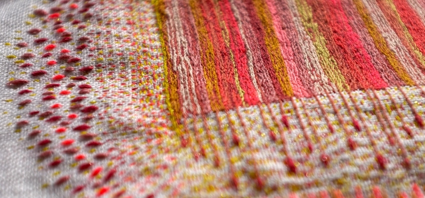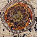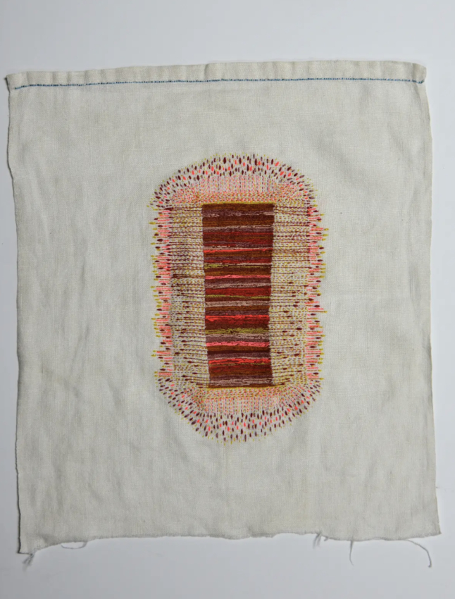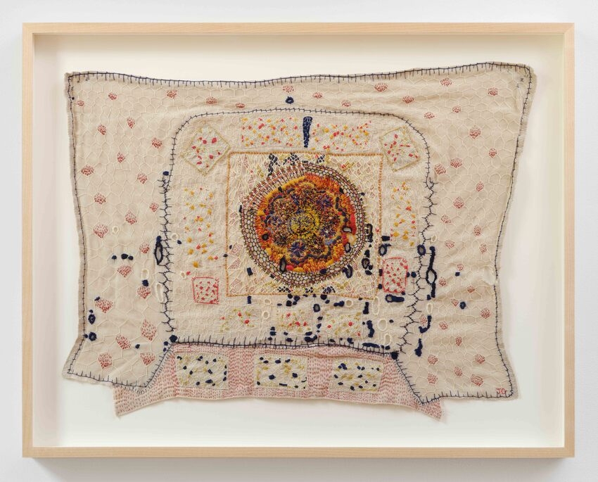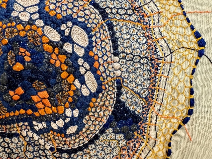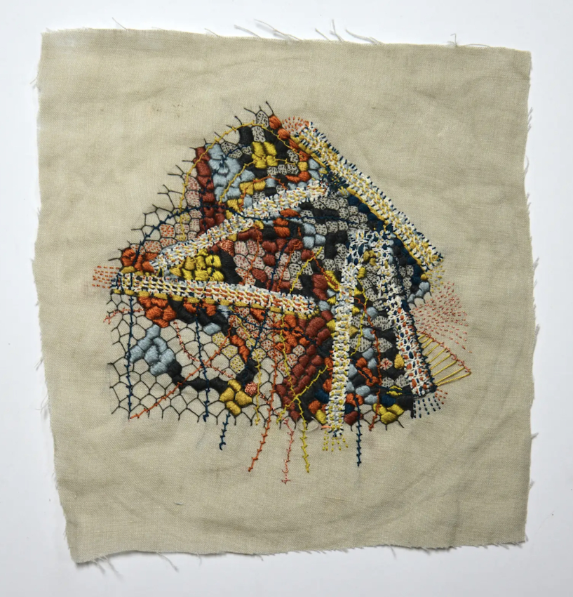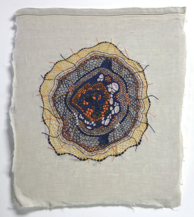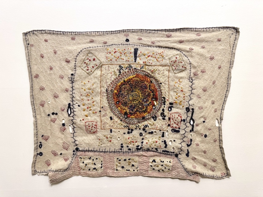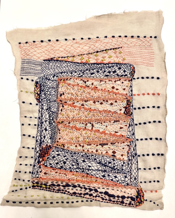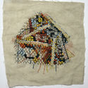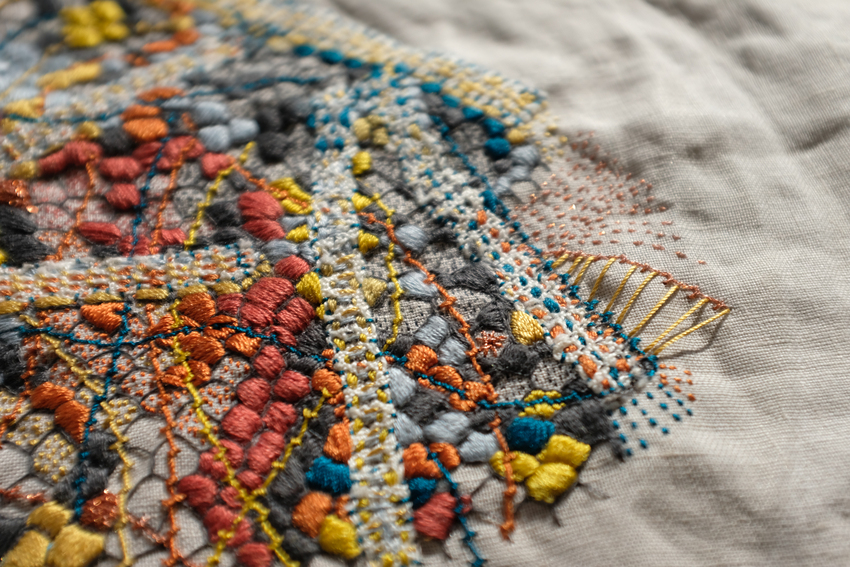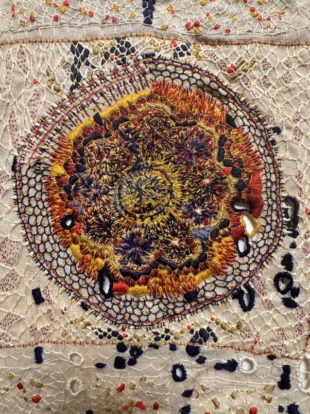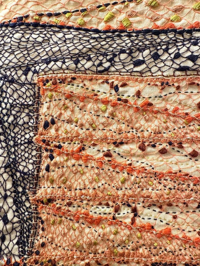 cotton and silk thread and antique wire lace on linen