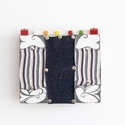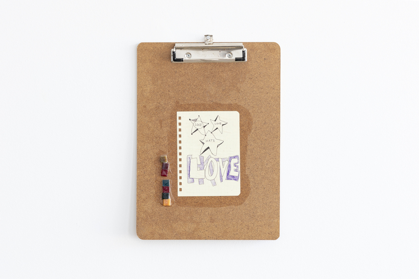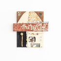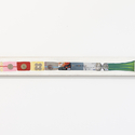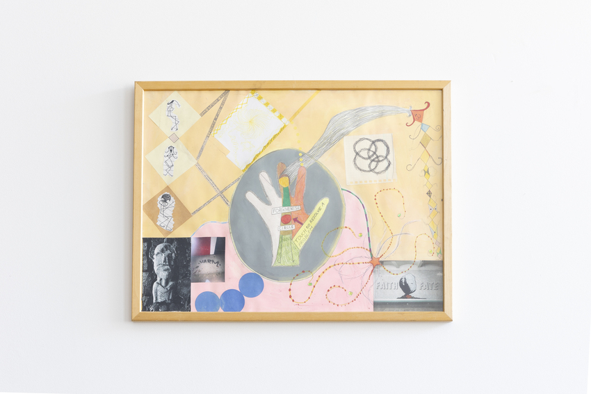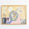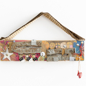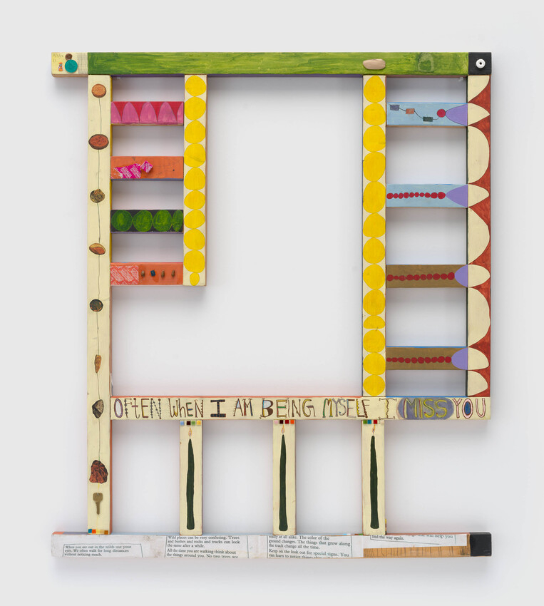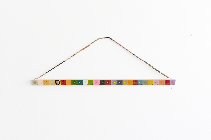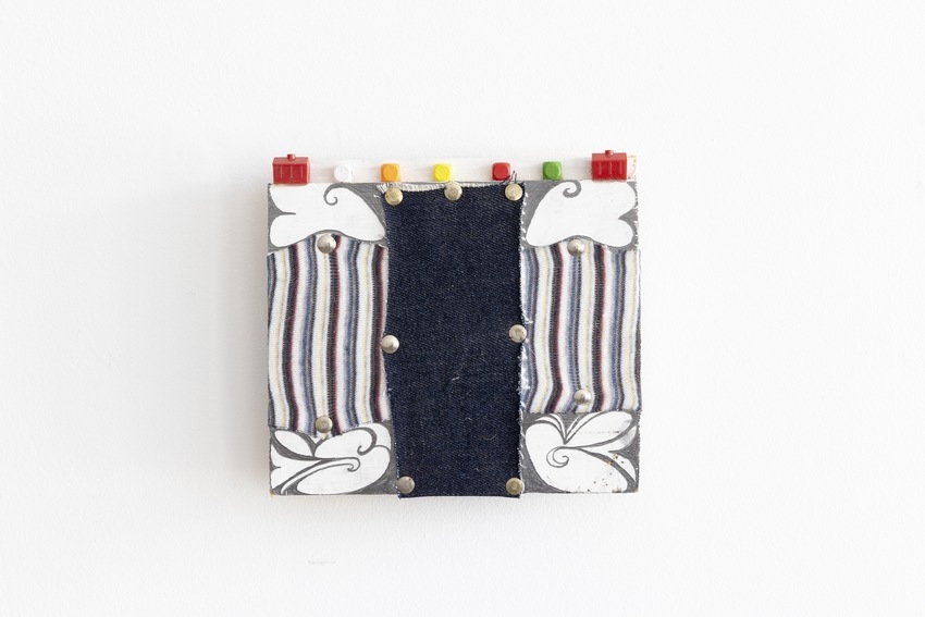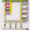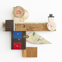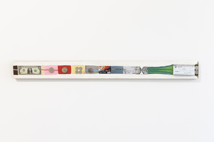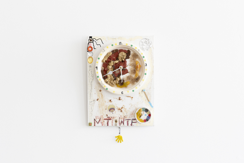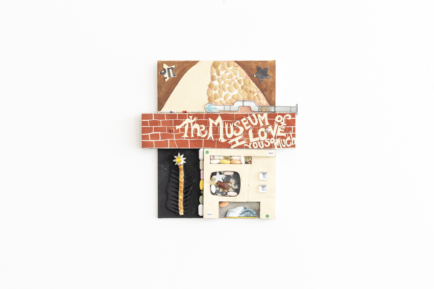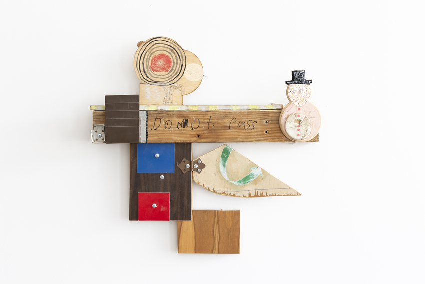 Acrylic, pencil, glue, paper, chewed gum, Life Saver, Now and Later, cherimoya seed, glass tile, Vermont driftwood, and key on wood