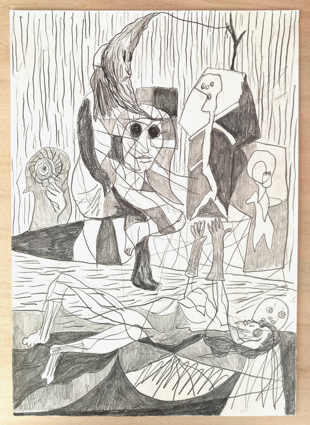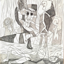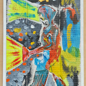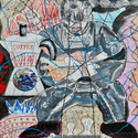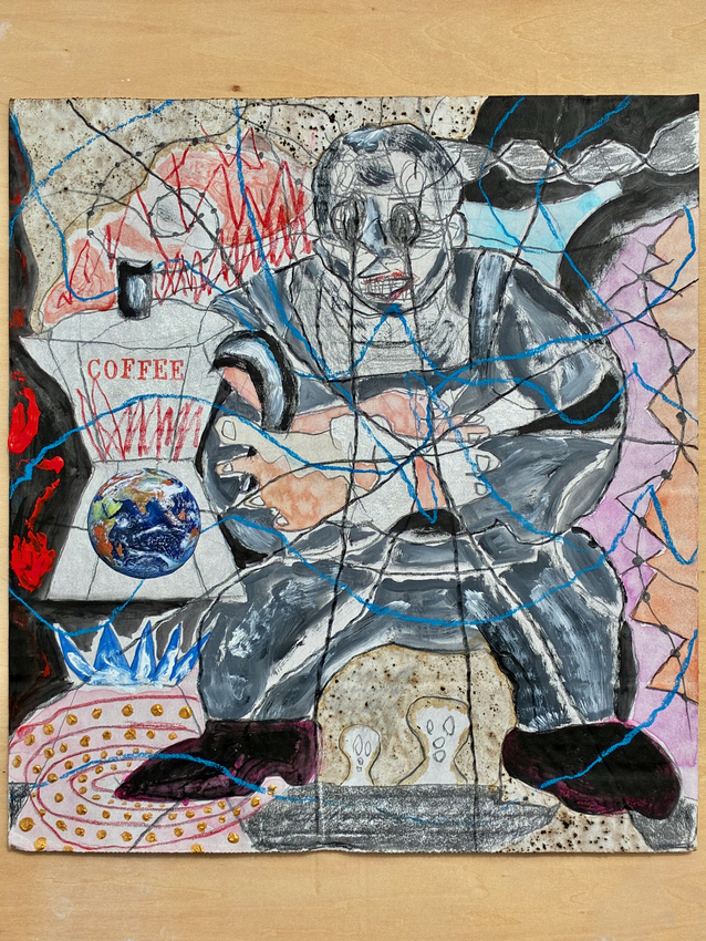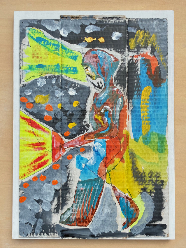 crylic, watercolor, pencil, dermatograph, colored pencil, pastel, stamp, varnish, collage and coffee on corrugated board