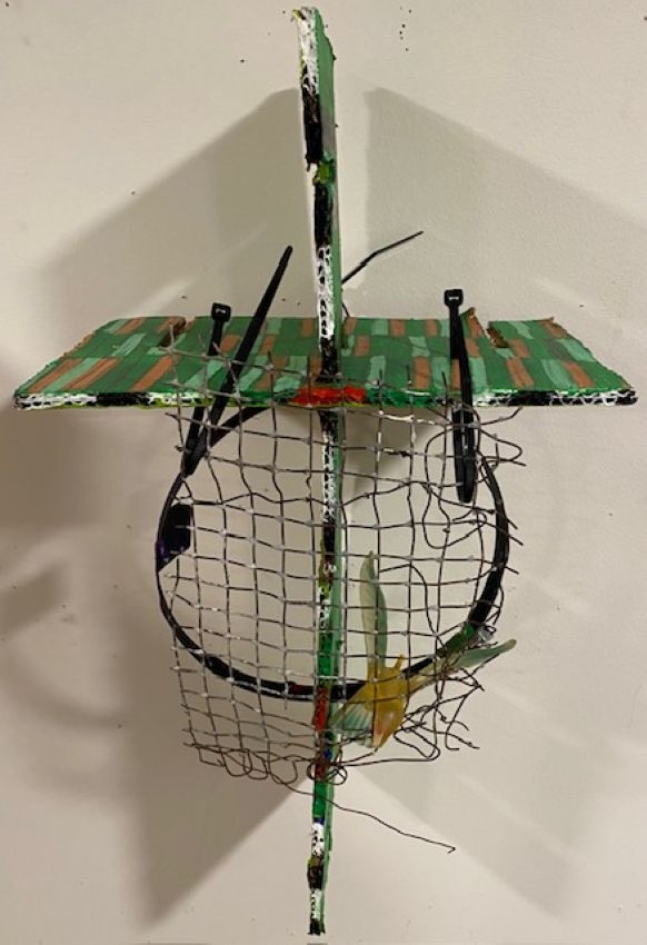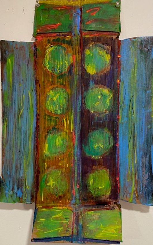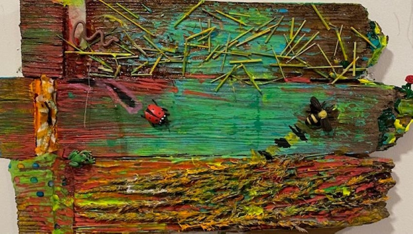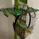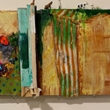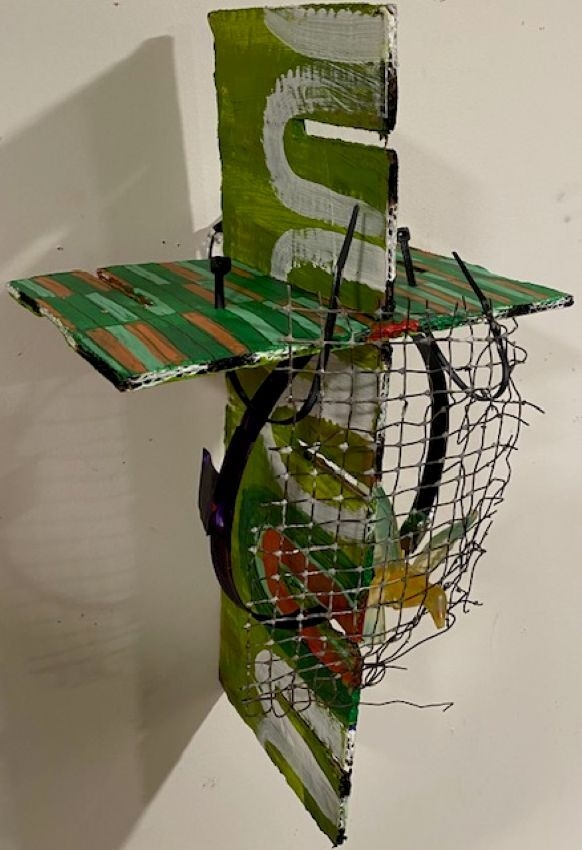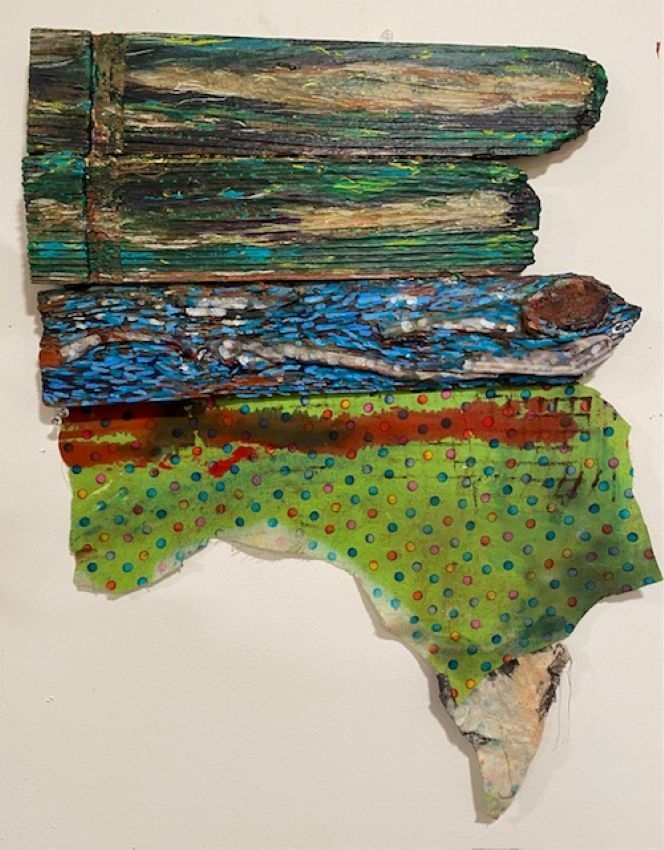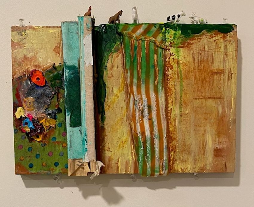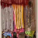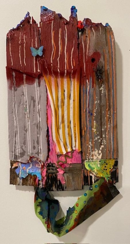 salvaged wood, fabric, acrylic paint and chips, plastic toys