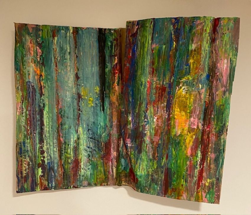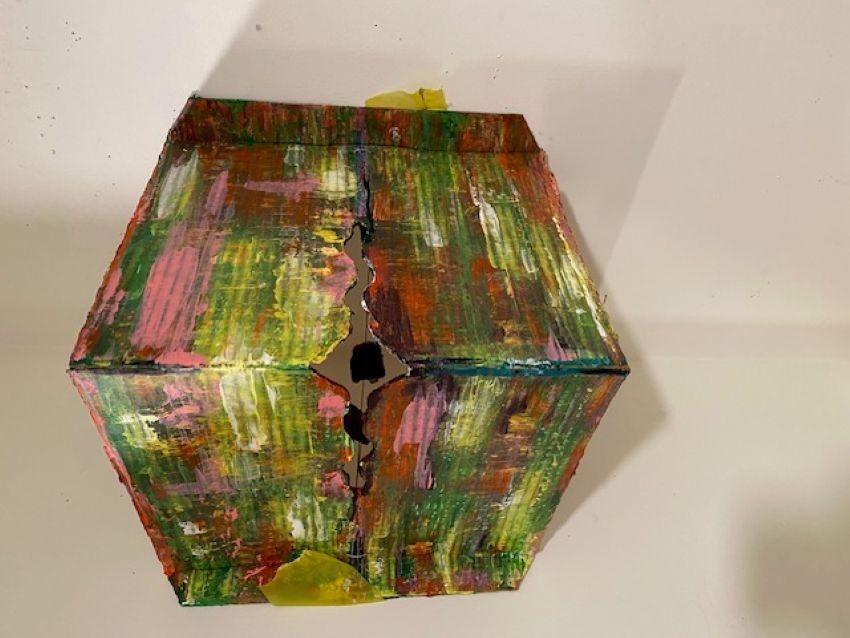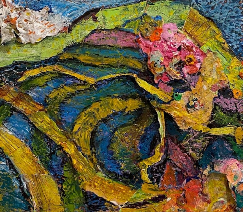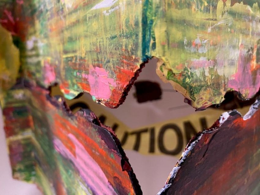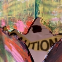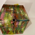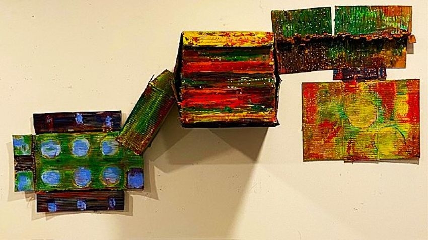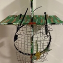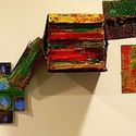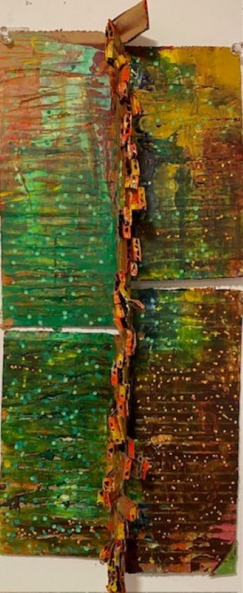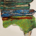 salvaged wood, fabric, acrylic paint and chips, plastic toys