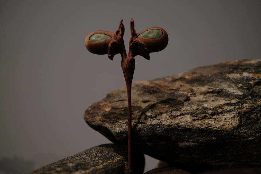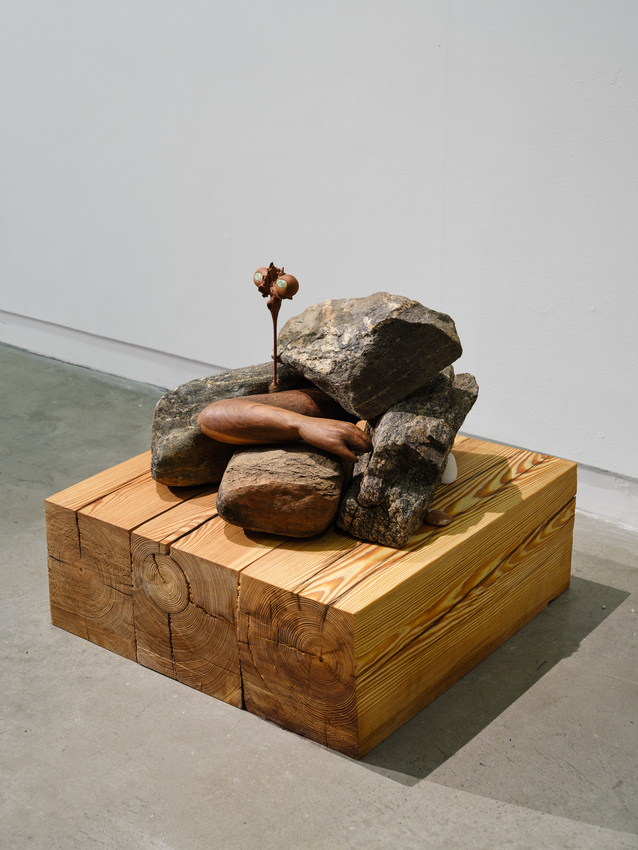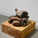 reclaimed ash wood, black locust, and river stones